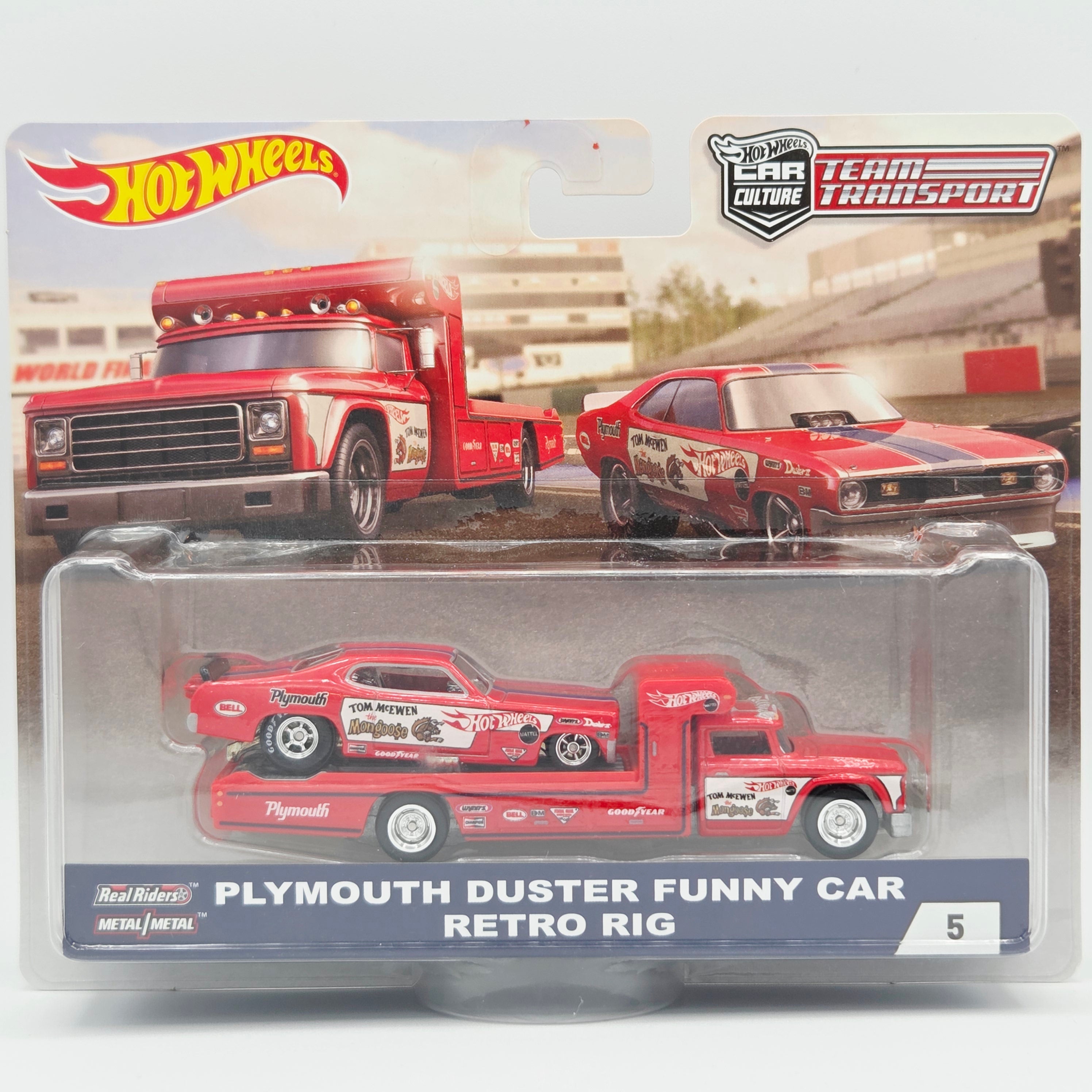 Hot Wheels Team Transport - Plymouth Duster Funny Car Dragster & HW Retro Rig "Mongoose" (2018 Team Transport, Car Culture)